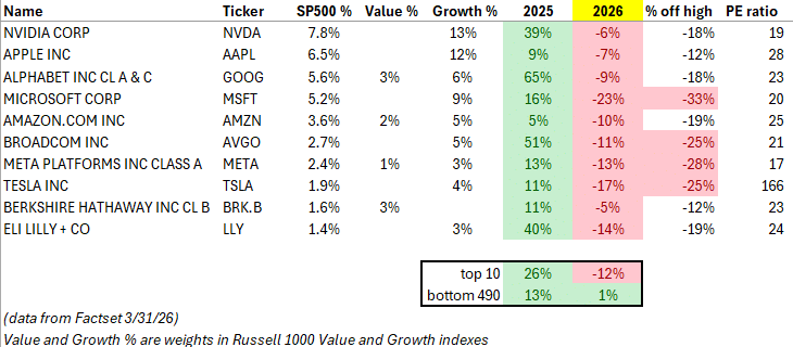 The ten largest stocks in the S&P500 Index (below) beat “the rest” by 13 percentage points in calendar year 2025 and are lagging by the same degree through Q1 2026. These biggest companies account for 38% of the S&P500 Index weight, 9% of the Russell 1000 Value Index, and a whopping 59% of the Russell 1000 Growth Index.