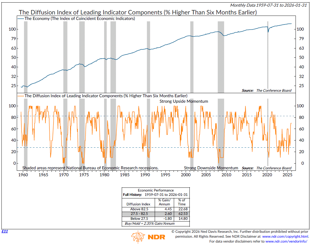 In the US, we expect explicit and implicit fuel surcharges to be added to many goods and services, and it remains to be seen how these and other hot-war-related expenses will be distributed. Fortunately, the economy was demonstrating positive forward momentum prior to this conflict. As seen below, as of late January 2026, the ISM’s Diffusion Index of Leading Indicator Components (the percentage of indicators higher than six months earlier) was the broadest in four years, at 70%: