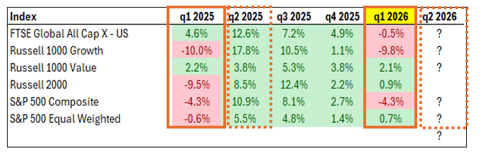 Stock market returns in Q1 2026 were remarkably similar to the year-ago returns of Q1 2025. In both quarters, large growth fell and large value rose. In subsequent months last year, large growth stocks then recovered strongly after a similar decline. Whether that happens again is part of our discussion.