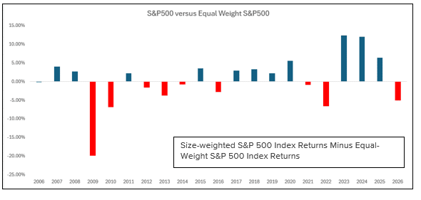 Considering the “Large” in “Large Growth” may help explain the recent relative weakness in the market’s ten largest stocks and why this rotation from biggest into everything else has occurred. The law of large numbers suggests companies like Microsoft or Nvidia, whose market capitalizations exceed $2.5 trillion, may be hard-pressed to continue to grow earnings at the rapid pace of the last few years. Historically, investors are wary of paying high P/E ratios for companies where the earnings upside is tougher to achieve. Many active investors appear to be reconsidering what appropriate valuation levels ought to be for behemoth companies well past their entrepreneurial years – and reevaluating what weight these companies deserve in their portfolios. Only in recent years (2023-2025) has it become “normal” for the size-weighted S&P500 to continuously trounce the average stock, as seen below. It may continue to become less normal going forward.